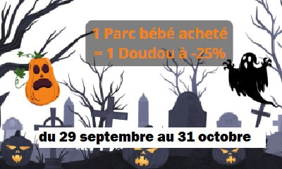 Pour 3 articles achetés dans les collections Hochet bébé et/ou Doudou un Serre-tête Halloween offert.